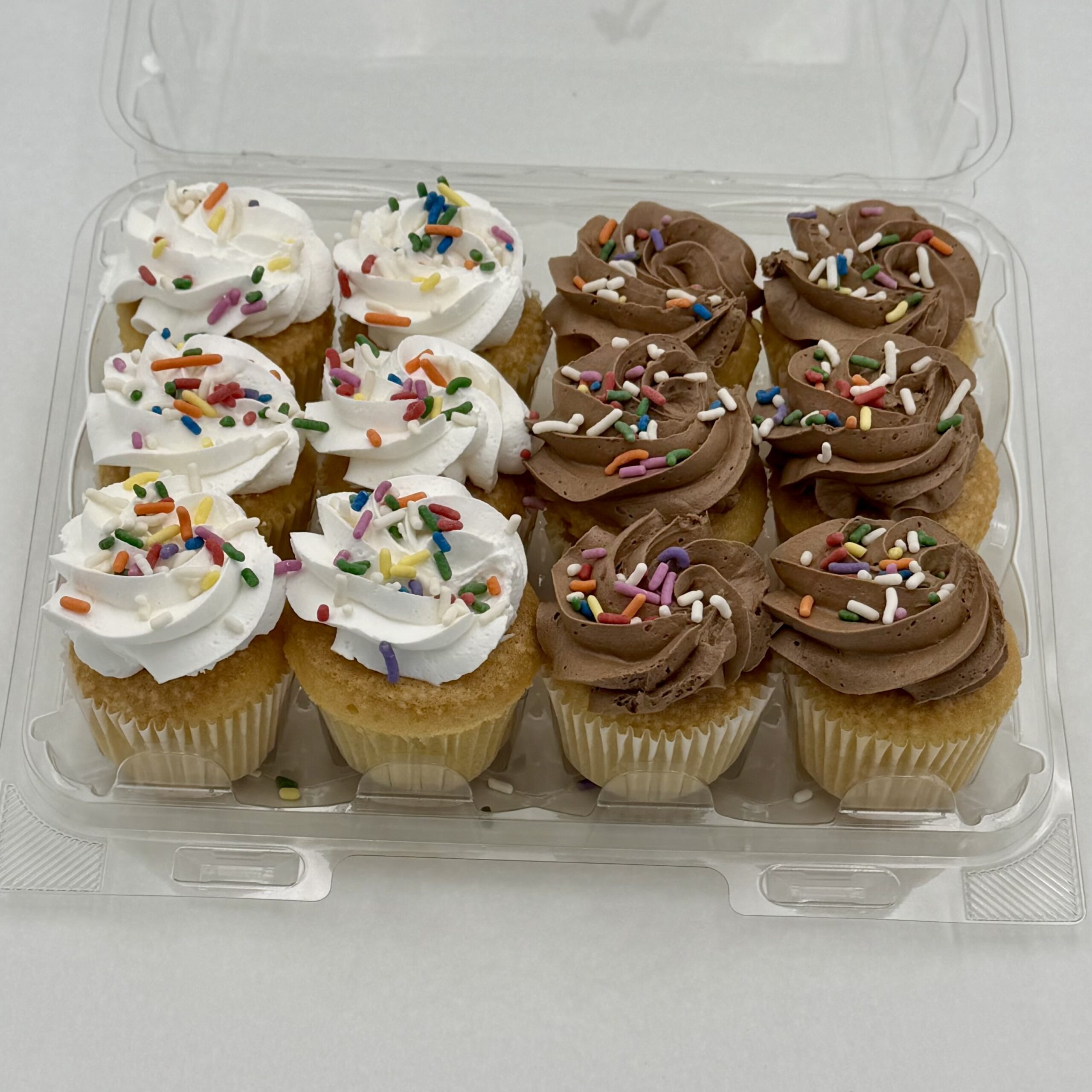 12 mini vanilla cupcakes: 6 with chocolate “buttercream” icing and 6 with vanilla “buttercream” icing. Sprinkle colors may vary depending on the season.