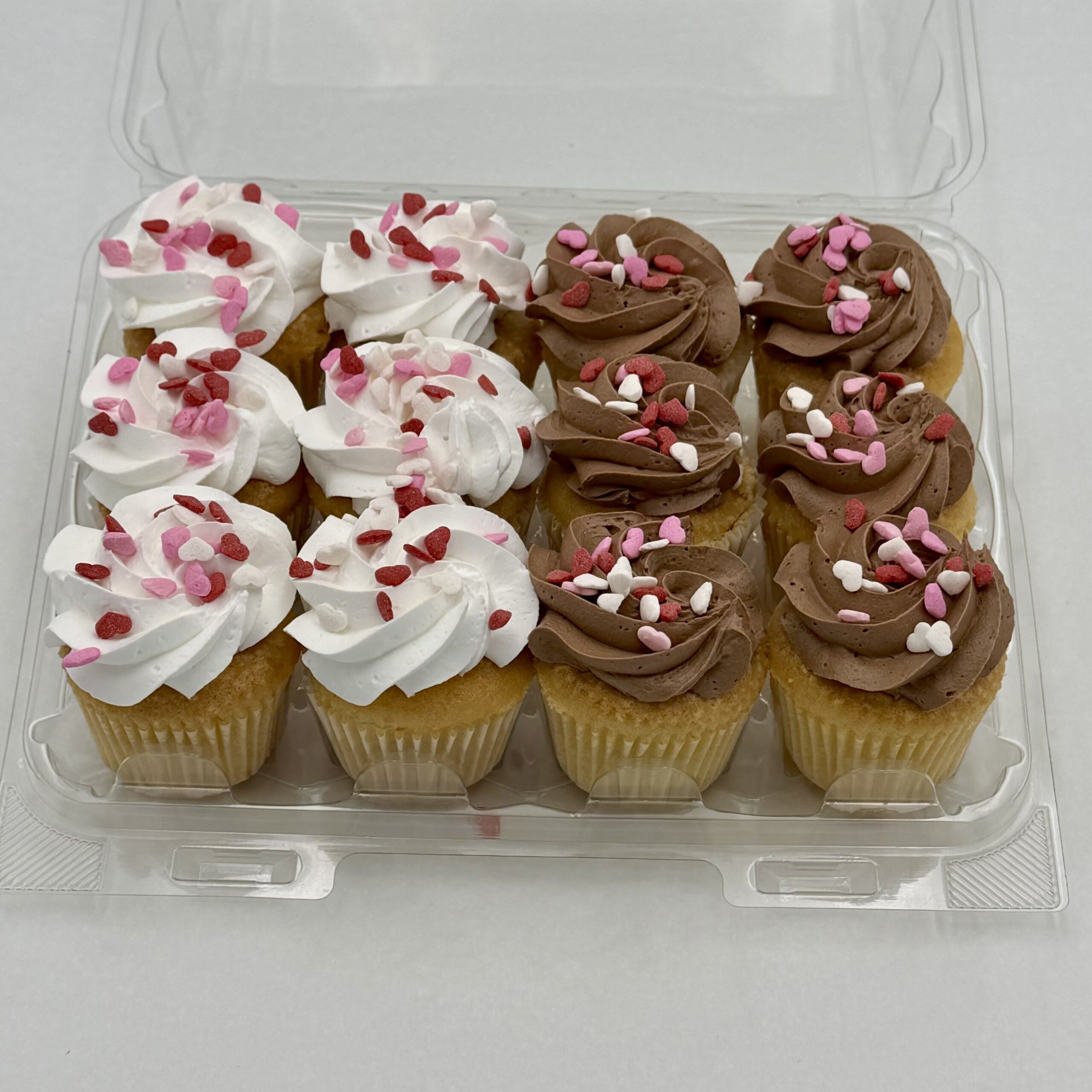 12 mini vanilla cupcakes: 6 with chocolate “buttercream” icing and 6 with vanilla “buttercream” icing. Sprinkle colors may vary depending on the season.
